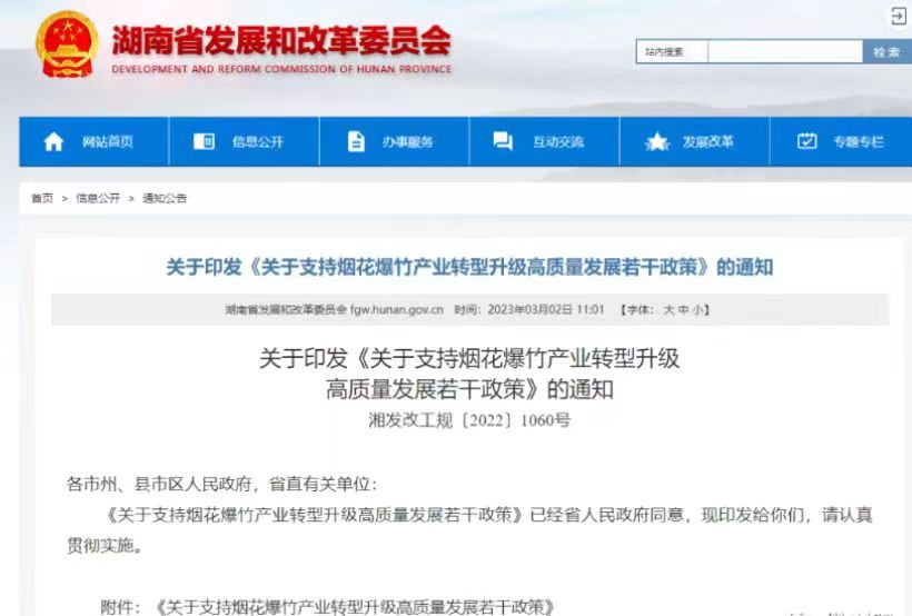 今天湖南省發(fā)改委官網(wǎng)公布關于印發(fā)《關于支持煙花爆竹產業(yè)轉型升級高質量發(fā)展若干政策》的通知具體內容如下: